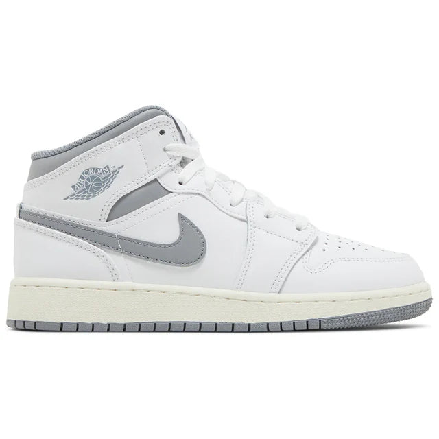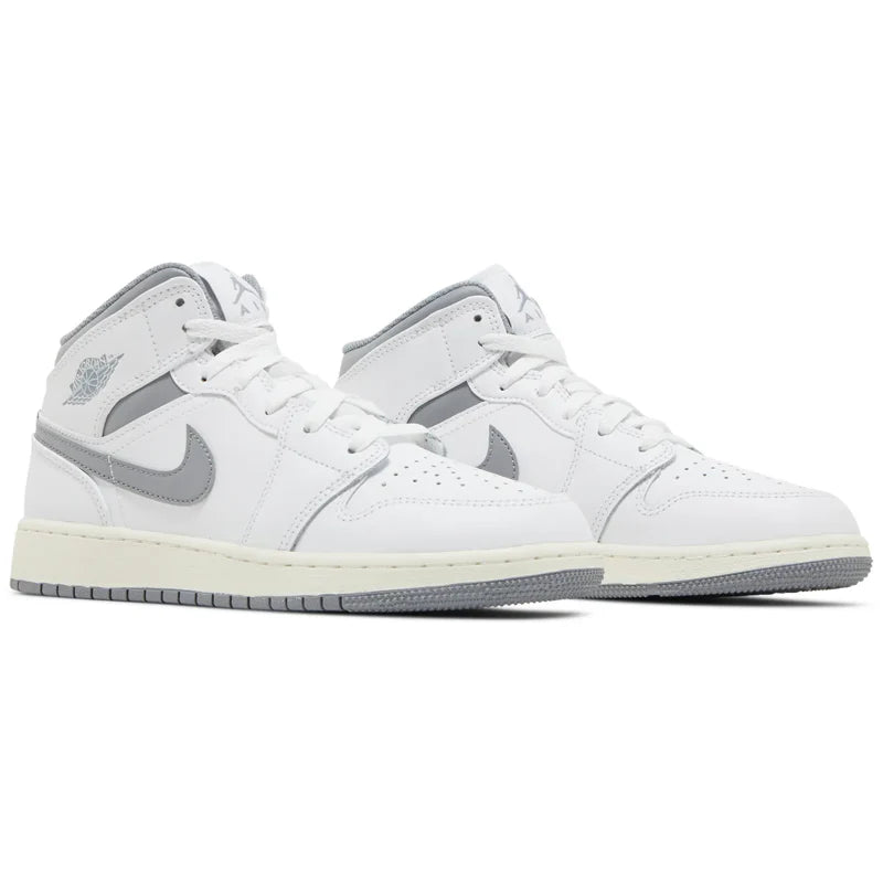 Arriving in kids sizing, the Air Jordan 1 Mid GS features a white leather upper, with Neutral Grey accents on the Wings logo, Swoosh and and collar area. A white midsole sits atop a Neutral Gray rubber outsole, finishing the look.