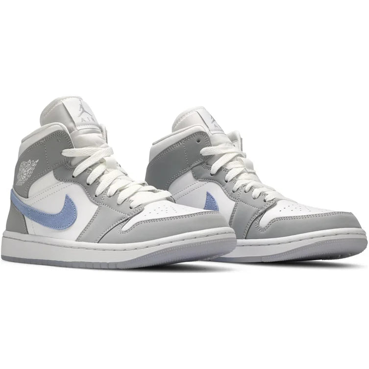 The women's Jordan 1 Mid Wolf Grey Aluminum (W) features a white leather upper with Wolf Grey Durabuck overlays and an Aluminum Swoosh. From there, a Jumpman woven tongue label and icy translucent sole completes the design.