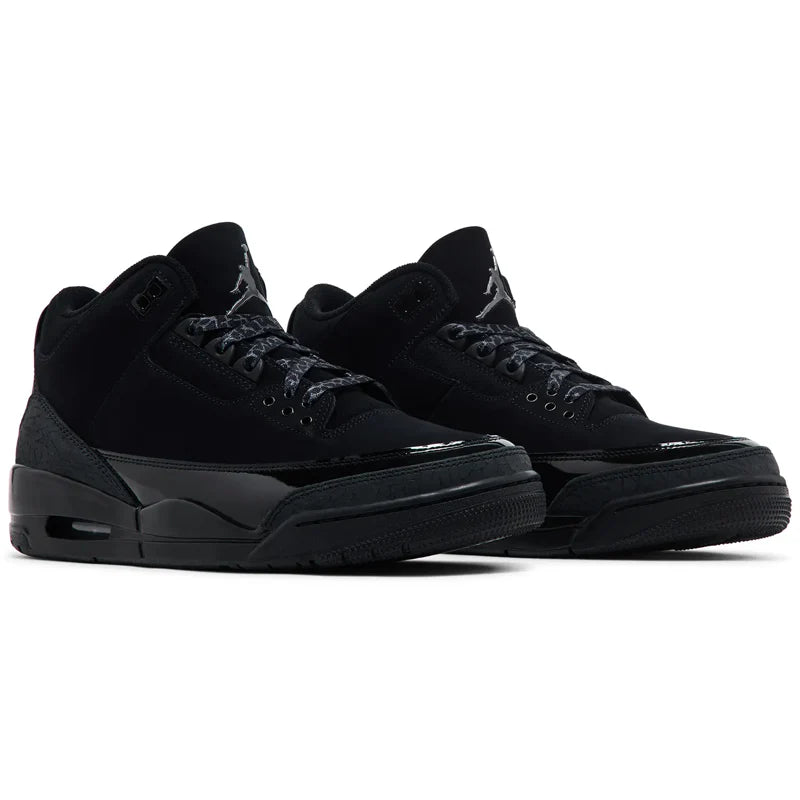 The 2025 edition of the Air Jordan 3 Retro 'Black Cat' brings back a monochrome colorway of the legacy silhouette, named after one of Michael Jordan's many nicknames and originally released in 2007. Built with black nubuck, the upper features a matching black patent leather mudguard and charcoal elephant-print overlays at the forefoot and heel. Jumpman branding adorns the tongue and molded back tab. Lightweight cushioning is provided by a glossy black polyurethane midsole with an exposed Air-sole unit in the heel.