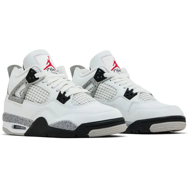 The 2025 edition of the Air Jordan 4 Retro OG 'White Cement' utilizes a layered white leather upper equipped with quarter panel netting and black molded eyelets. Tech Grey accents, covered in black speckled detailing, land on the TPU support wings, Air-assisted polyurethane midsole, and heel tab, the latter marked with Nike Air branding. A vibrant flash of color arrives via a crimson Jumpman logo on the Flight tongue tag. Underfoot, the rubber outsole features flex grooves and a herringbone traction pattern.