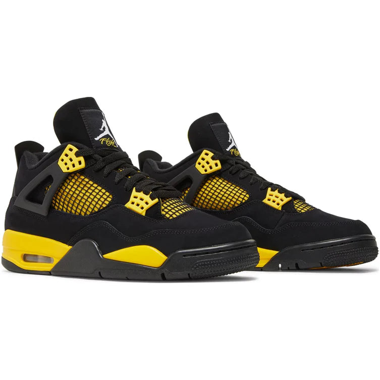 The 2023 edition of the Air Jordan 4 Retro ‘Thunder’ brings back the coveted colorway originally released in 2006 (and previously reissued in 2012). The upper is draped in smooth black nubuck, contrasted by hits of yellow on the molded eyelets, quarter panel, and lower tongue, with the latter two components covered in black netting. Jumpman branding appears on the Flight tongue tag and molded heel tab. Lightweight cushioning comes courtesy of a yellow polyurethane midsole, enhanced with an exposed Air-sole unit in the heel.
