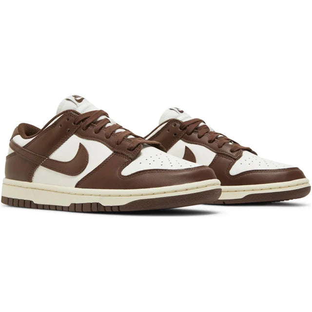 The Nike Women’s Dunk Low ‘Cacao Wow’ features smooth leather on the upper, featuring a white base with chocolate brown overlays and a color-matched Swoosh. Traditional Nike branding appears on the tongue tag, back tab and sockliner. A vintage off-white finish is applied to the midsole, fitted with an interior foam wedge and reinforced by a durable brown rubber outsole.