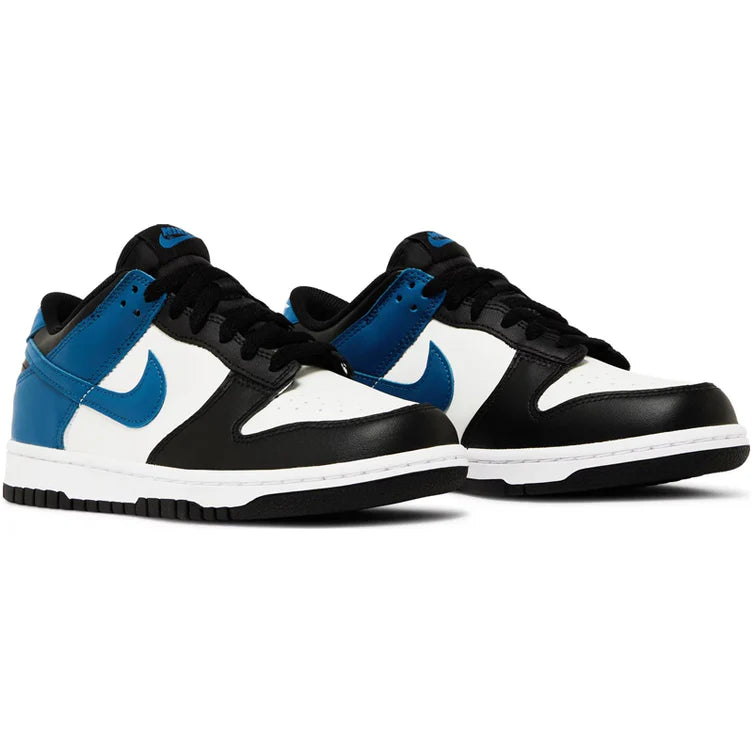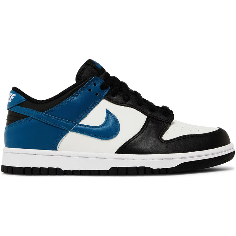 The Nike Dunk Low GS ‘Industrial Blue’ merges a traditional leather build with refreshed colors. The upper features a crisp white base with a forefoot overlay in black. Contrasting blue accents land on the signature Swoosh, heel overlay and Nike-branded back tab. Perforated detailing on the toe box offers improved breathability, while a padded low-cut collar delivers a comfortable fit. Underpinning the sneaker is a sturdy cupsole, highlighted by white sidewalls and a grippy black rubber outsole.