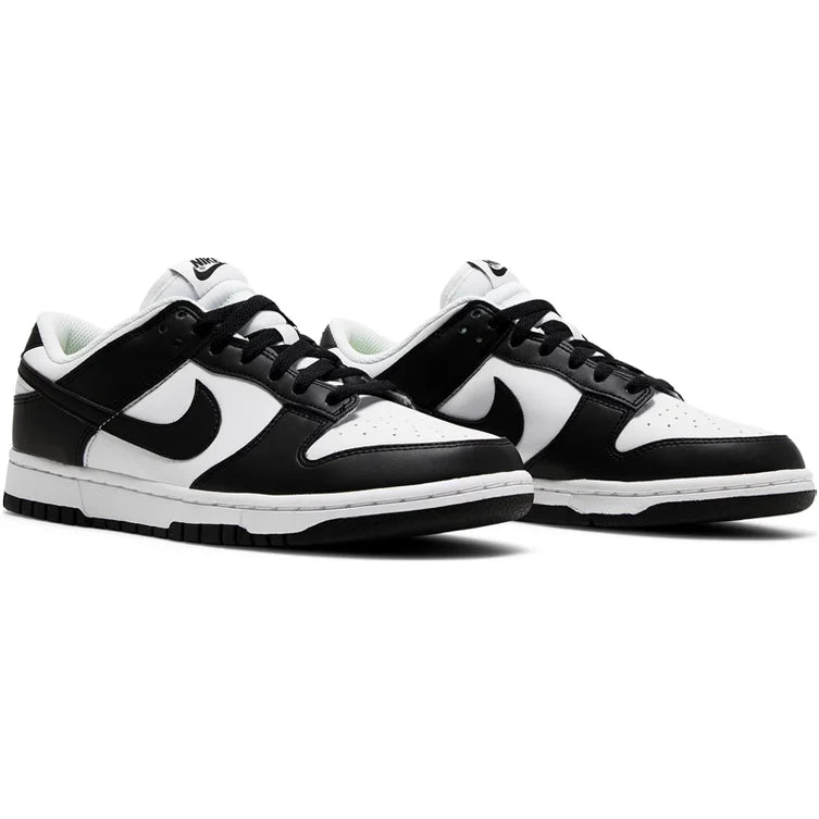 The Nike women’s Dunk Low Next Nature ‘Panda’ gives the essential two-tone colorway a refreshed build incorporating at least 20% recycled content by weight. The synthetic leather upper pairs a clean white base with contrasting black overlays. Standard branding elements include a woven Nike tongue tag and an embroidered Nike wordmark on the heel tab. A contrasting pop of color appears on the sockliner, rendered in a neon green finish and accented with Nike’s pinwheel logo. The low-top is mounted on a durable rubber cupsole, featuring white sidewalls and a black rubber outsole.