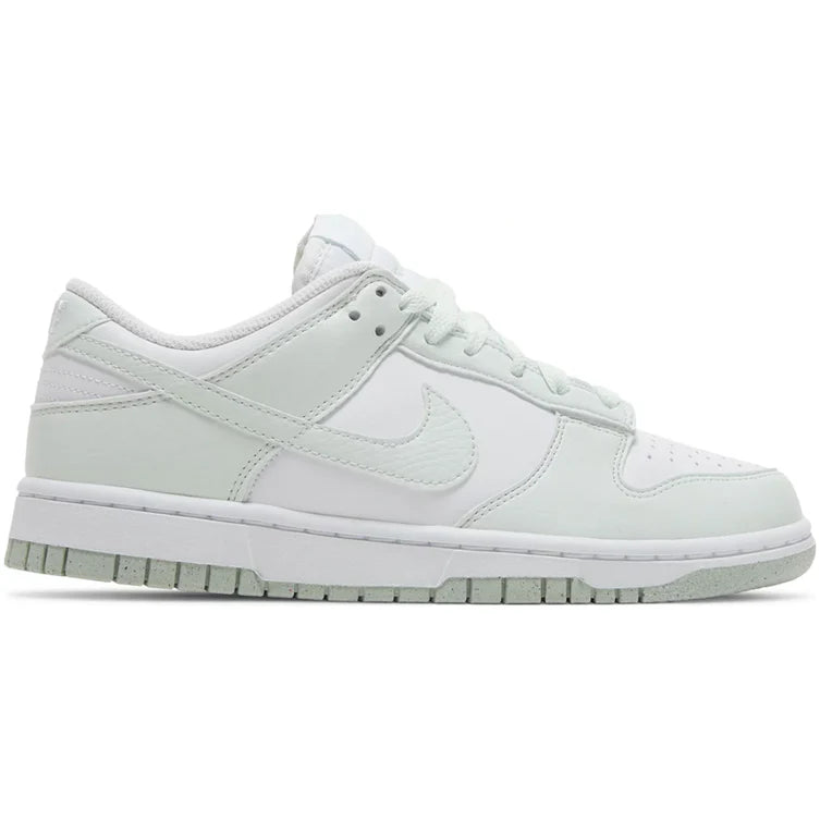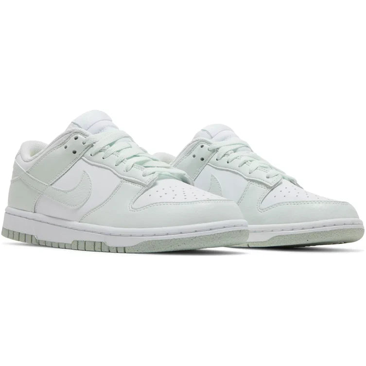 The Nike women’s Dunk Low Next Nature 'White Mint' combines a pastel two-tone palette with a sustainable build made with at least 20% recycled materials by weight. The synthetic leather upper features a pristine white base with lightly textured forefoot and heel overlays in a pale mint green hue. Standard Nike branding lands on the woven tongue tag and leather heel tab, while the Volt-colored mesh sockliner is stamped with Nike’s retro pinwheel logo.