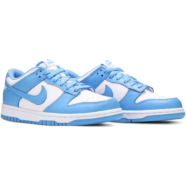 The Nike Dunk Low ‘University Blue’ features a leather upper in a color-blocked design redolent of the shoe’s collegiate hardwood roots. A crisp white base is contrasted by a pastel blue finish on the shoe’s eyestay, Swoosh, and heel and forefoot overlays. Classic Nike branding lands on the woven tongue tag and heel tag. The low-top sits on a durable rubber cupsole, underpinned by an outsole that features performance-ready traction.